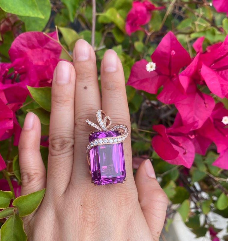 We’re delighted to bring to you the finest vivid violet/pink 66ct kunzite made into a unique pendant in 18k rose gold. Accompanied by 2.5cts of round brilliant cut diamonds uniquely wrapping the face of the kunzite with a bow on top, continuing to fabulous diamond swirls on the rear.